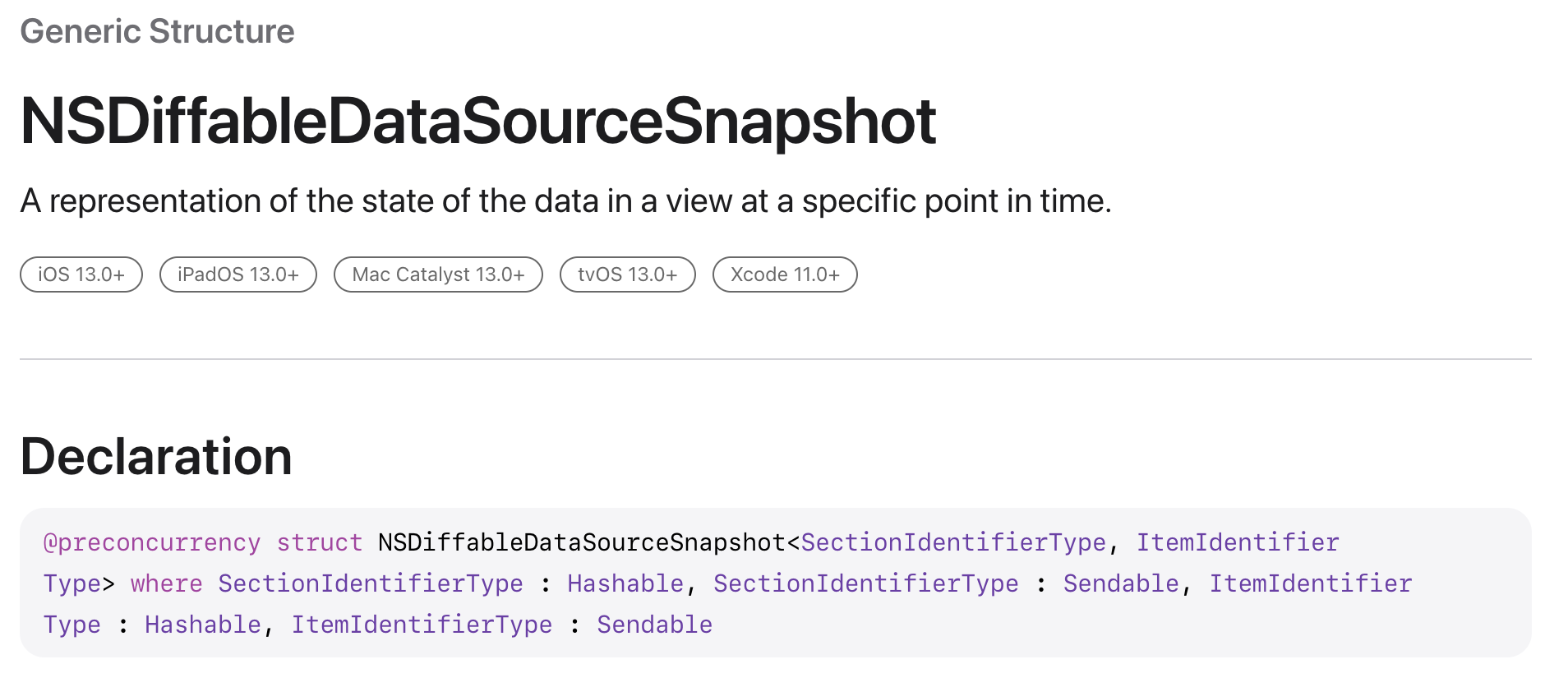 A representation of the state of the data in a view at a specific point in time. 특정 시점에 대해서 데이터에 대한 상태를 표현한것 이라고 되어있군요. iOS 13부터 사용이 가능하며, Generic Structure로써 SectionIdentifiertType 그리고 ItemIdentifierType을 받아야 하고 이는 모두 Hashable 과 Sendable 을 채택해야 합니다. 또한 앞에는 @proconcurrency 라는 propertyWrapper 가 달려있군요. 이 세가지에 대해서 한번 알아보겠습니다.